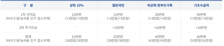 - 기본 1차 지급: 1인당 15만 원부터 40만 원까지.