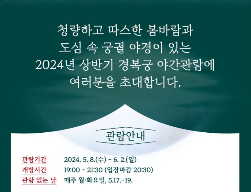 청량하고 따스한 봄바람과 도심 속 궁궐 야경이 있는 2024년 상반기 경복궁 야간관람 티켓 예매를 위한 정보 포스팅 입니다.