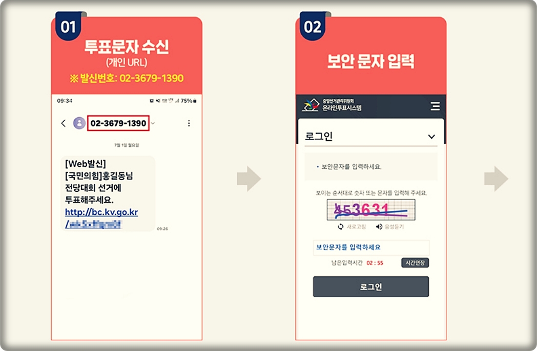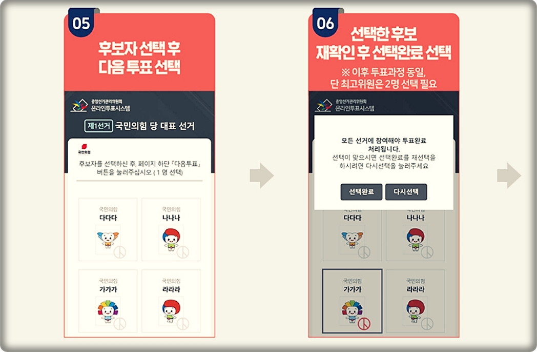 받은 문자에 링크를 통해 참여하고 화면에 보이는 보안문자를 입력시간안에 넣고 로그인을 하면 본인인증번호(주민등록앞자리)를 입력할 수 있습니다. 이 과정을 정상적으로 진행하면 투표 화면에 진입하게 되고 후보자의 기호와 이름을 확인하고 선택하면 다시 한번 선택이 맞는지 질문 후 선택완료 합니다. 당대표 1명 최고위원2명, 청년최고위원 1명을 선택할 수 있으며 차 후 선발이 끝나면 본문을 통해 확인해도 되고 국힘 홈페이지를 통해서도 확인이 가능 합니다. 최고위원을 택할때는 2명을 선택해야 하는점 참고 하시길 바랍니다.