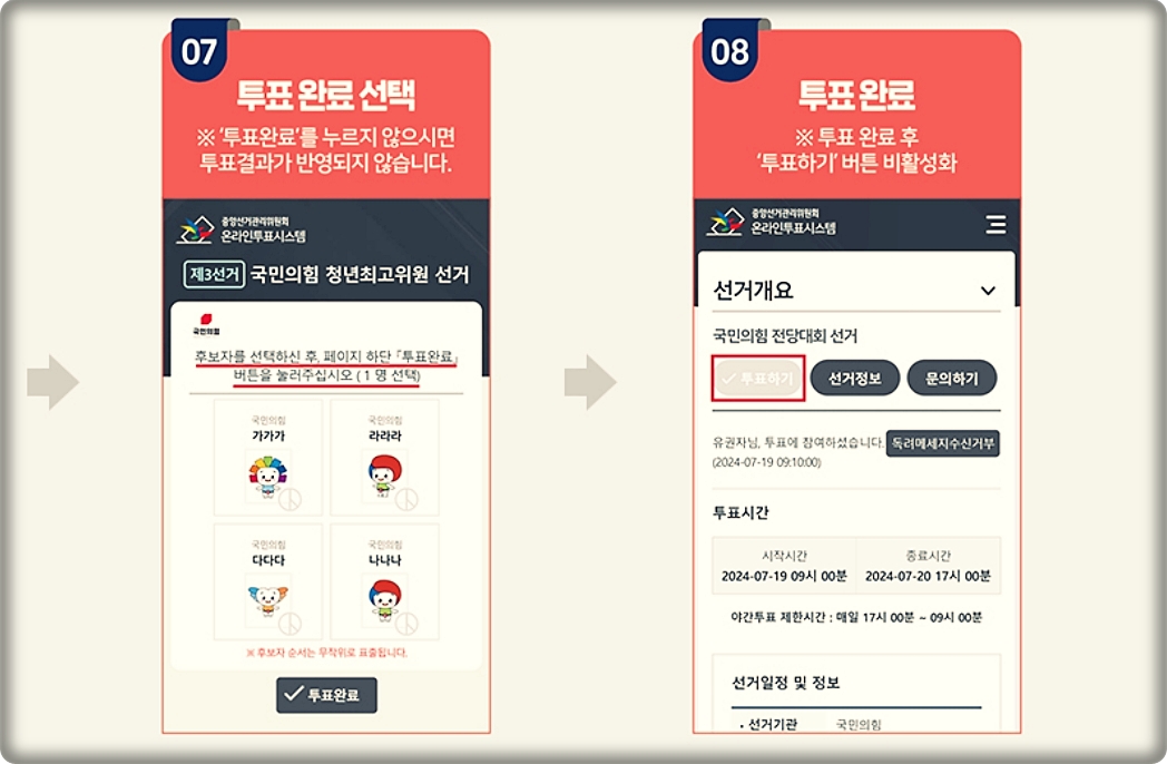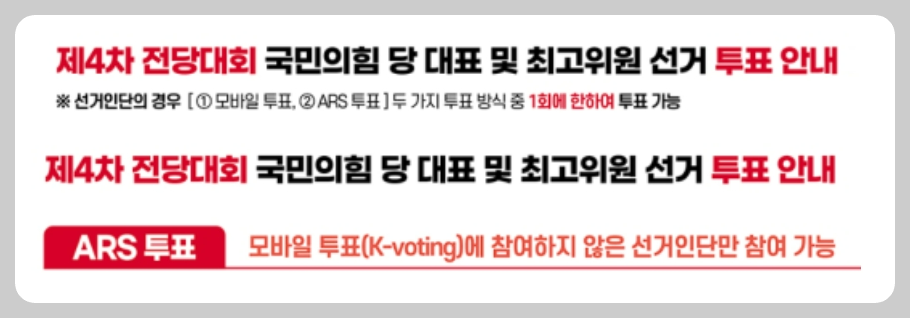2024년 7월 19일 ~20일 이틀동안 모바일 투표가 진행됩니다. 투표권이 있는 당원들에게 투표 문자가 전달되는데 링크를 클릭하면 국민의힘 당대표,최고의원, 청년최고위원 선발 투표에 참여할 수 있습니다.