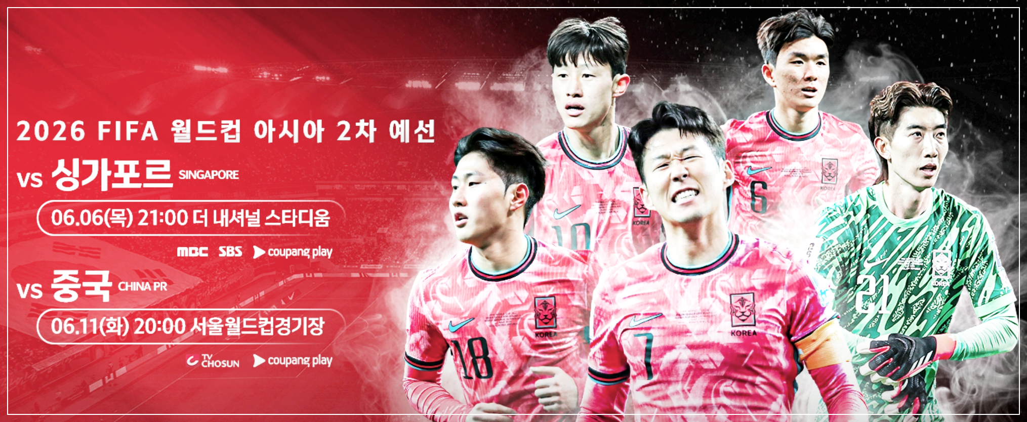 이번 2026년 피파 월드컵 아시아 2차 예선 대한민국 싱가포르 축구 중계 보는 곳은 MBC와 SBS 그리고 모바일 생중계는 쿠팡플레이에서 볼 수 있습니다. 쿠팡플레이는 30일 무료로 볼 수 있는데 보는 방법은 하단의 링크에서 확인 가능 합니다.