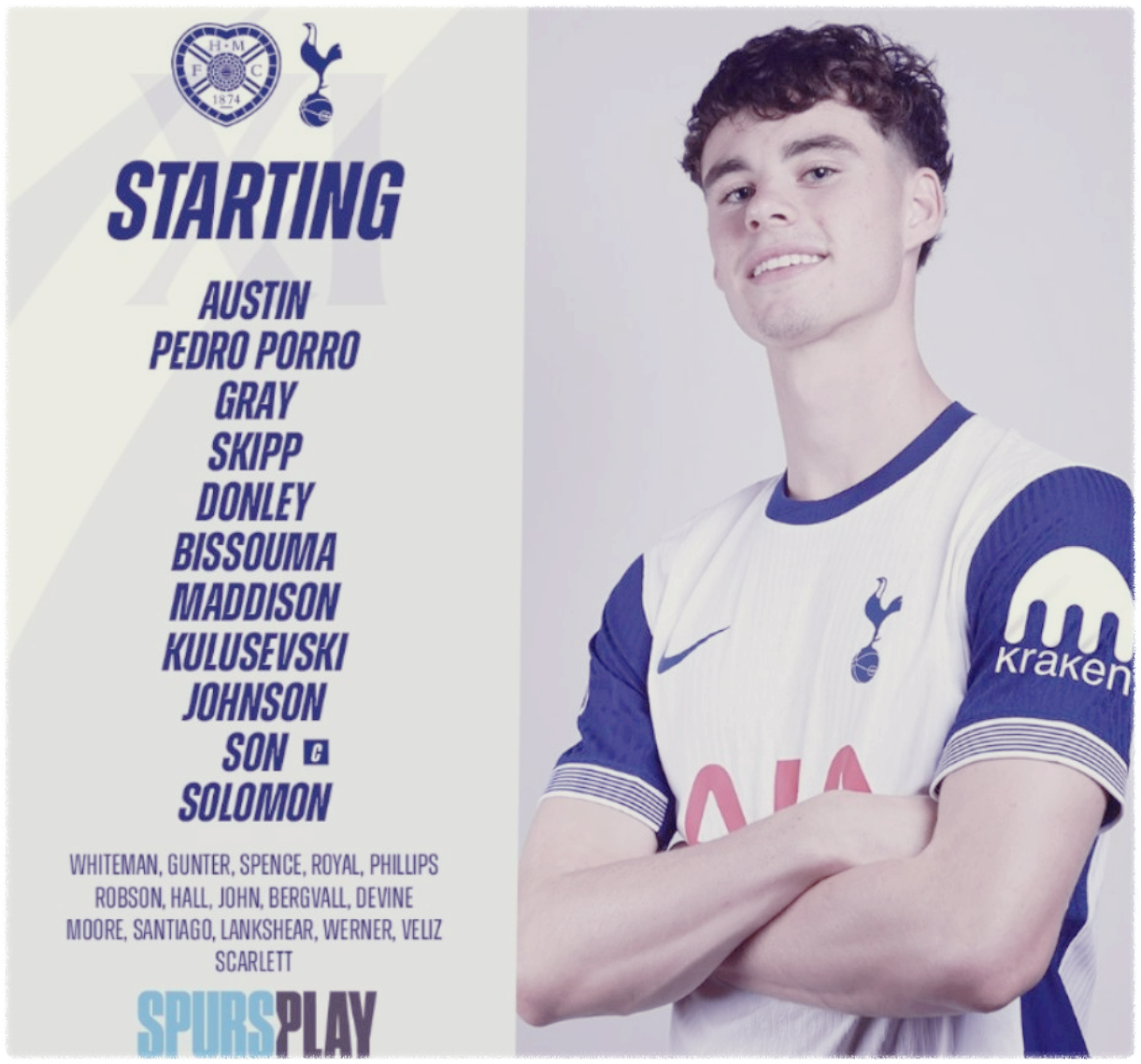 7월 18일 하트 오브 미들로디언과의 경기에서 토트넘 선발 선수는 손흥민을 필두로 브레넌 존슨과 마노르 솔로몬이 공격진 선발로 나오고 미드필더에는 이브 비수마, 제임슨 매디슨, 데얀 클루세프스키가 출전 했습니다. 그리고 신입생 아치 그레이가 선발로 출전 하였는데 그는 골을 넣지는 못했지만 마이키 무어와 애슐리 필립의 골에 도움을 주면서 활약하여  축구 전문 매체 풋볼 런던에서 9점을 받았습니다. 손흥민은 풋볼 런던에서 7점을 받아 역시 높은 점수를 받았습니다.