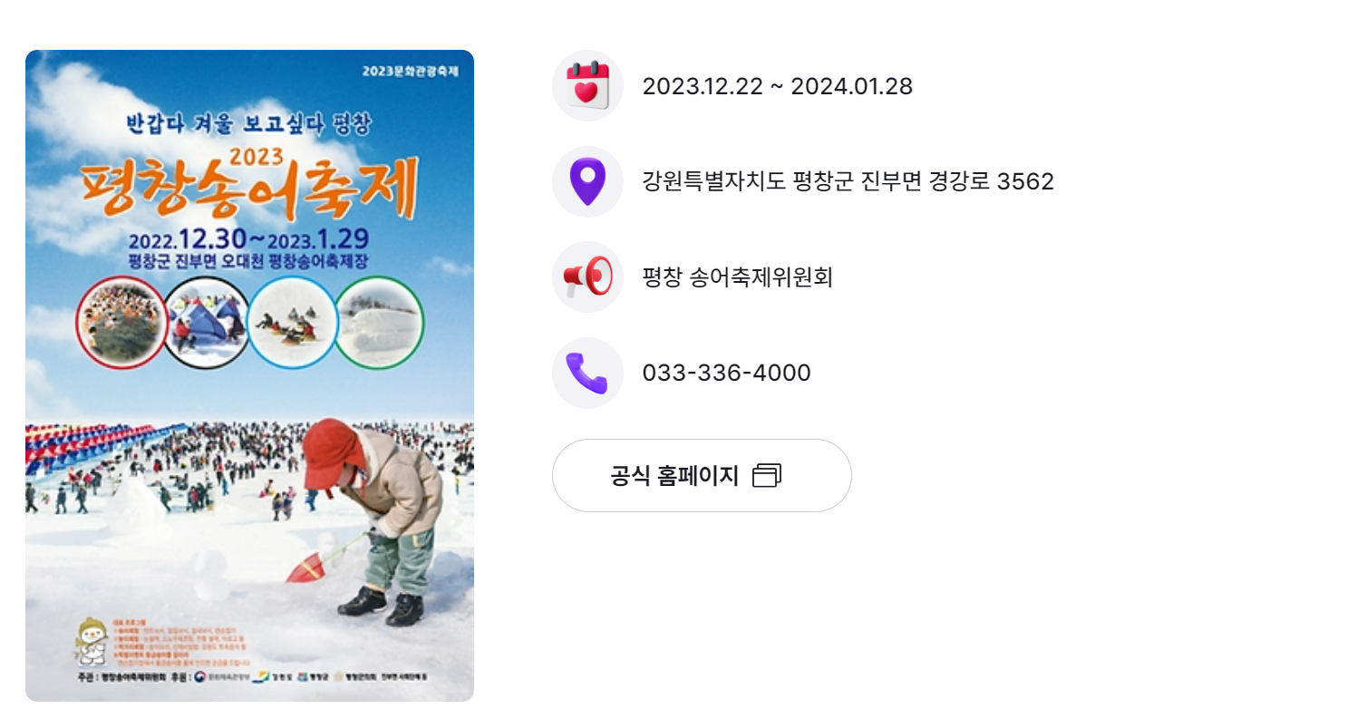 평창송어축제에 관심이 있으신 여러분들을 위해 기본정보를 소개해드리려고 해요. 평창송어축제는 매년 겨울에 평창에서 개최되는 대한민국 대표적인 축제 중 하나로, 송어를 중심으로 다양한 행사와 체험 프로그램이 열리는데요. 이번 글에서는 축제 일정과 입장료, 주요 행사 등에 대해 알려드릴게요. 함께 평창송어축제를 즐겨보시죠! 평창송어축제는 대한민국 강원도 평창군에서 매년 개최되는 대표적인 축제 중 하나입니다. 이 축제는 국내외 관광객들에게 많은 사랑을 받고 있으며, 평창의 자연 경관과 다양한 문화 경험을 즐길 수 있는 특별한 행사입니다. 평창송어축제는 맛있는 송어 요리와 함께 다채로운 프로그램과 액티비티를 제공하여 방문객들에게 즐거운 경험을 선사합니다. 평창송어축제를 방문하기 위해서는 몇 가지 기본 정보를 알고 계셔야 합니다. 평창송어축제는 일정 기간 동안 개최되며, 축제 기간 동안은 다양한 부스와 행사가 열리게 됩니다. 평창송어축제의 일정과 장소, 입장료 등에 대한 정보는 공식 웹사이트나 관련 소셜 미디어를 통해 확인할 수 있습니다. 또한, 주차 시설과 대중교통 이용에 대한 정보도 사전에 알아두시면 좋습니다.