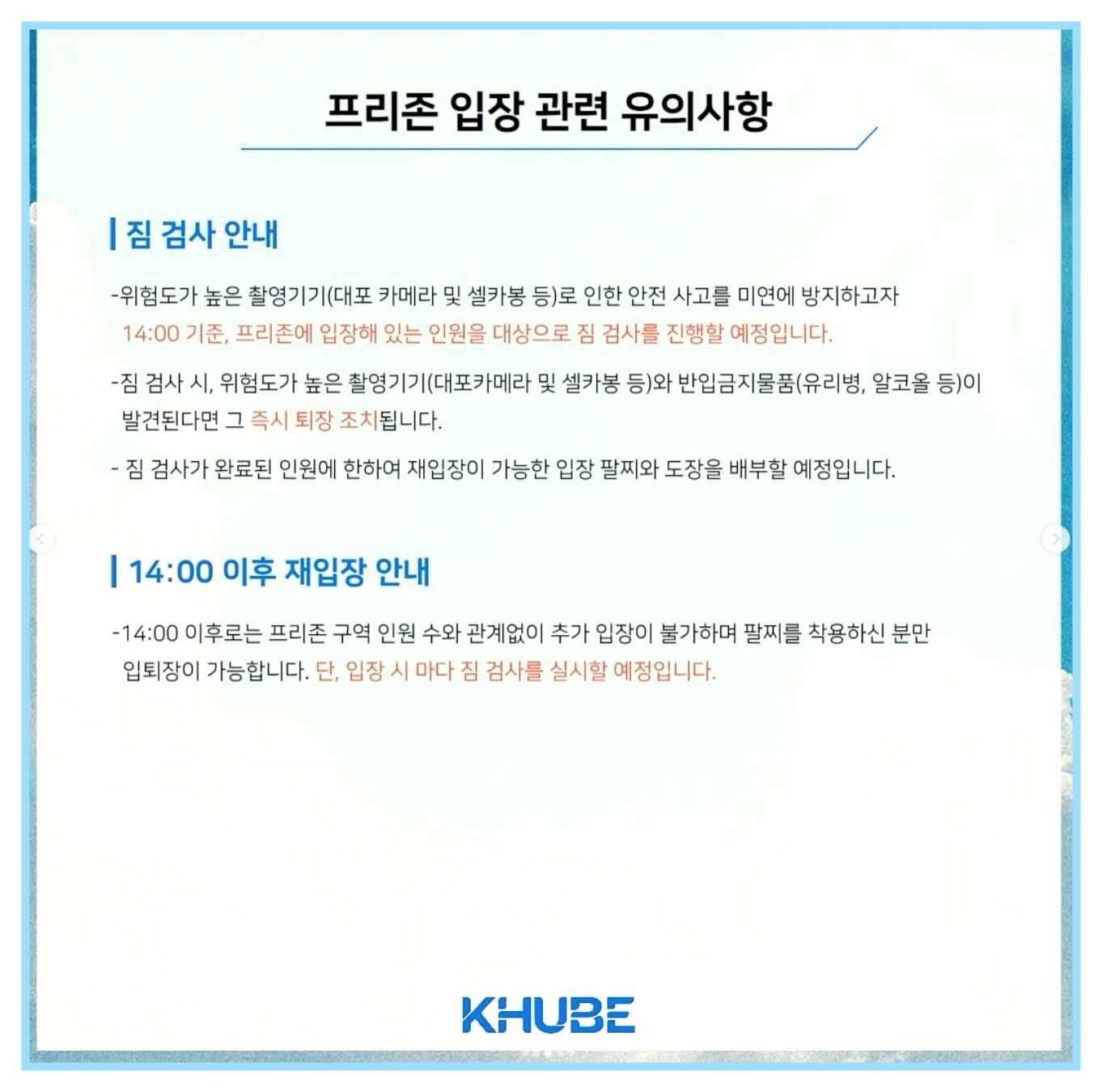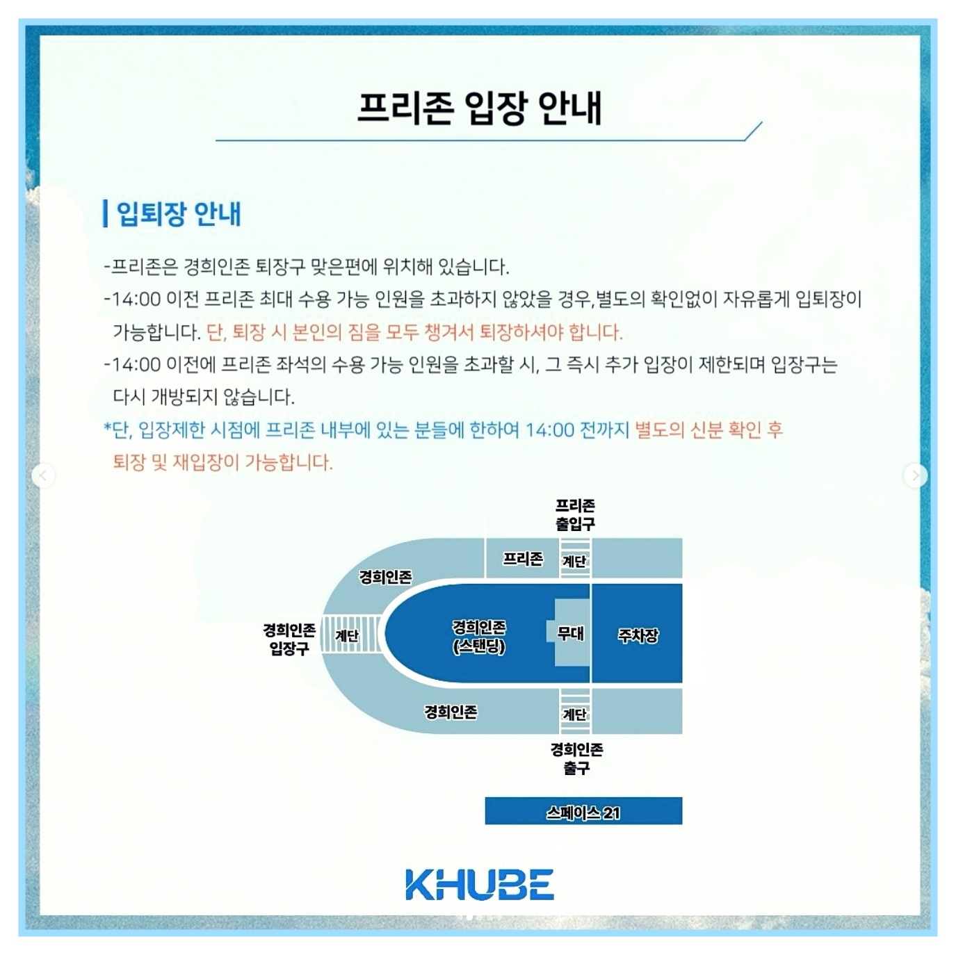 • 14:00(오후2시) 이전에 프리존 좌석의 수용 가능 인원을 초과할 시, 그 즉시 추가 입장이 제한되며 입장구는 다시 개방되지 않습니다. (단, 입장제한 시점에 프리존 내부에 있는 분들에 한하여 14:00 전까지 별도의 신분 확인 후 퇴장 및 재입장이 가능)