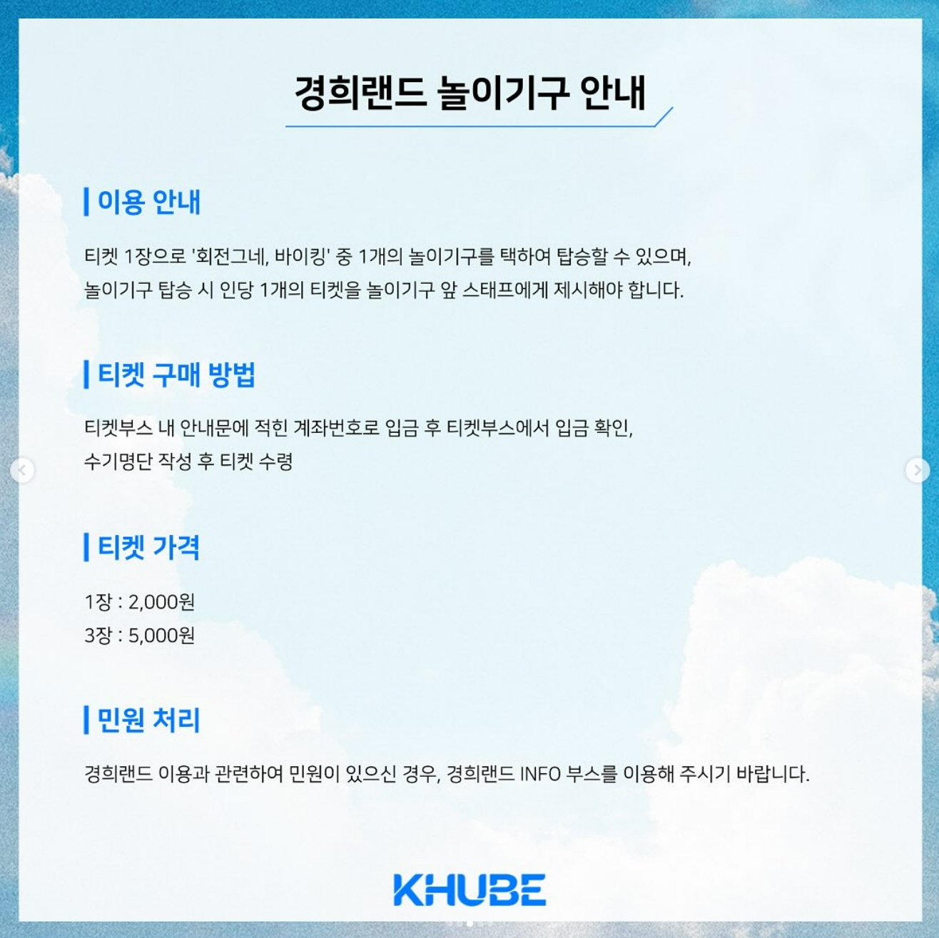 ‘회전그네, 바이킹‘ 중 1개의 놀이기구를 티켓 1장으로  택하여 탑승할 수 있으며, 놀이기구 탑승 시 인당 1개의 티켓을 놀이기구 앞 스태프에게 제시