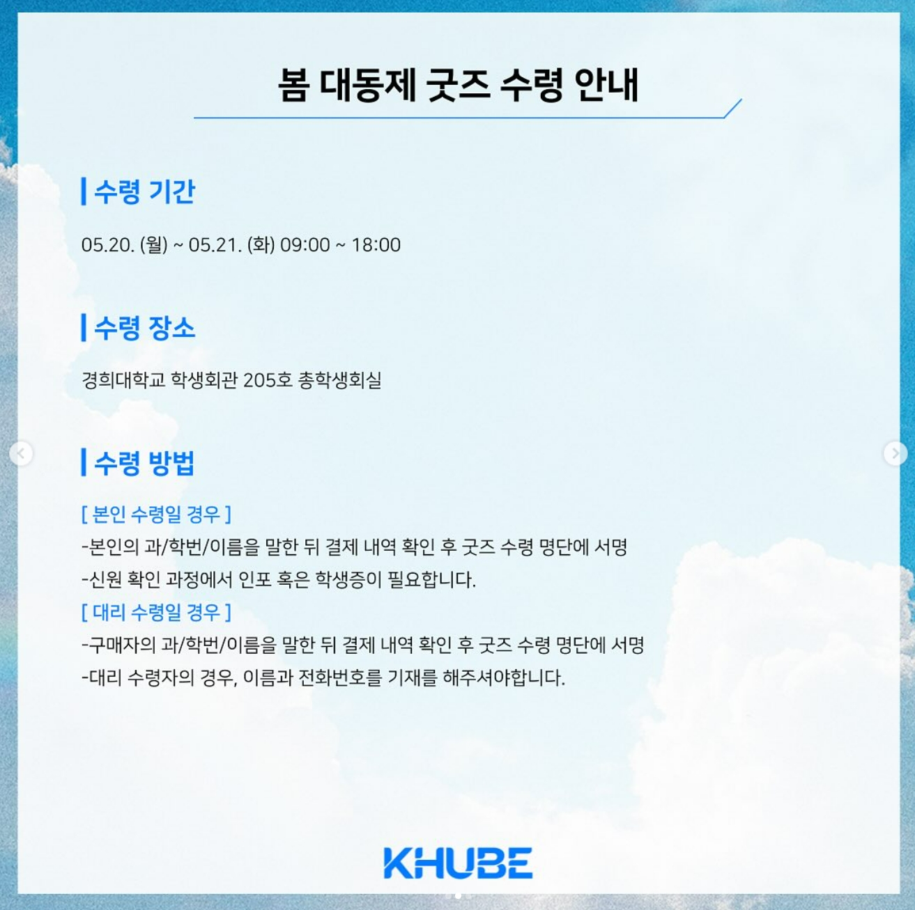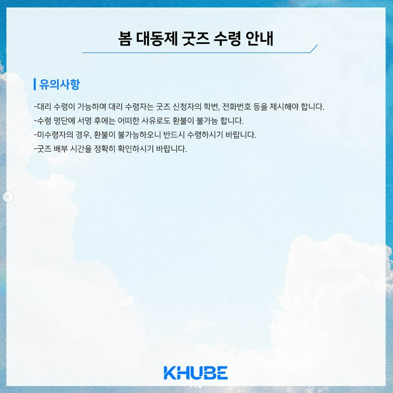 • 대리 수령이 가능하며 대리 수령자는 굿즈 신청자의 학번, 전화번호 등을 제시