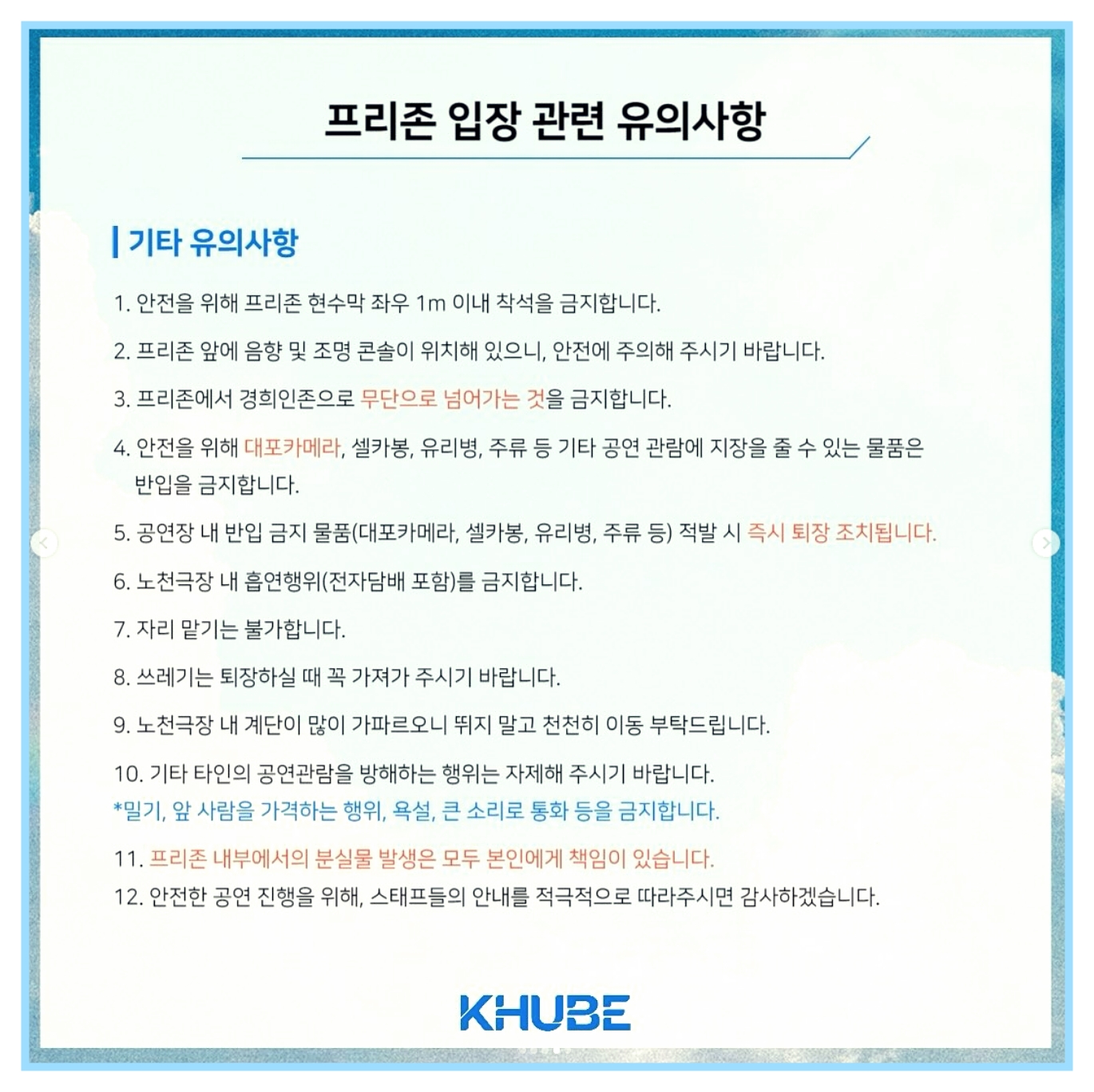 6. 안전을 위해 대포카메라, 셀카봉, 유리병 등 기타 공연관람에 지장을 줄 수 있는 물품은 반입 금지