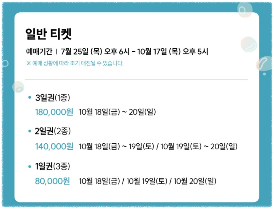 ✔️ 티켓 가격 : 1day 입장권: 80,000원 / 2day 입장권 : 140,000원 / 3day 입장권 : 180,000원