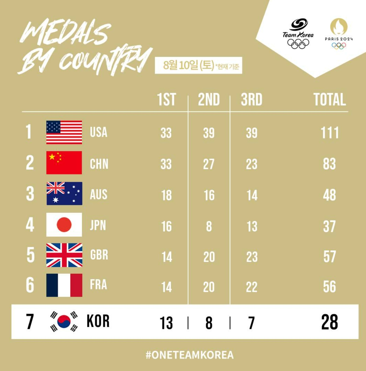 2024년 8월 5일 기준 파리 올림픽 종합순위 금메달,은메달, 동메달 상황 입니다.