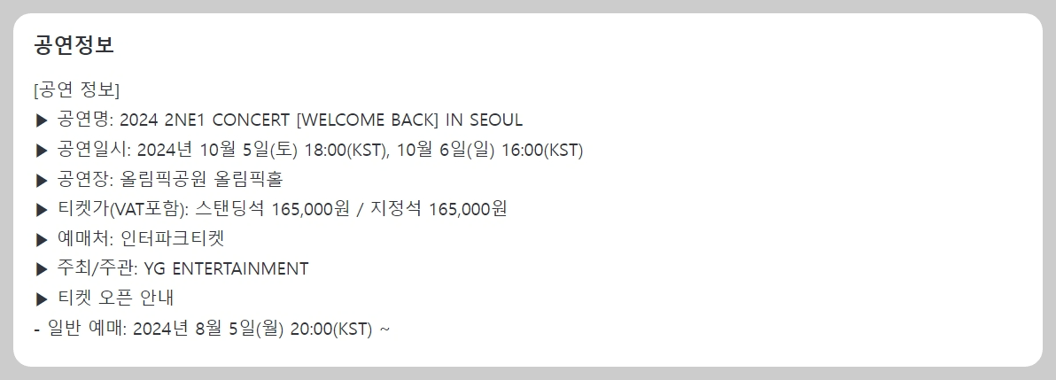 ✔️공 연 명 : 2024 2NE1 CONCERT [WELCOME BACK] IN SEOUL